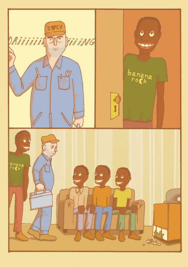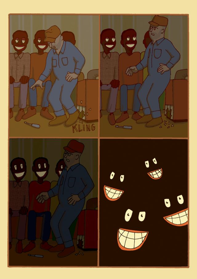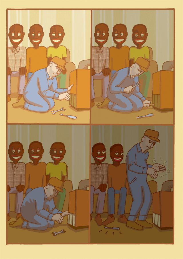 The facts weren’t as apocalyptic as they are portrayed in this comic. At a friend of my sister’s place a small piece of glass from the door of the stove was broken. My father, a good man, went to repair the damage tough he isn’t a repairmant and while he was working two adopted children sat on the sofa watching.