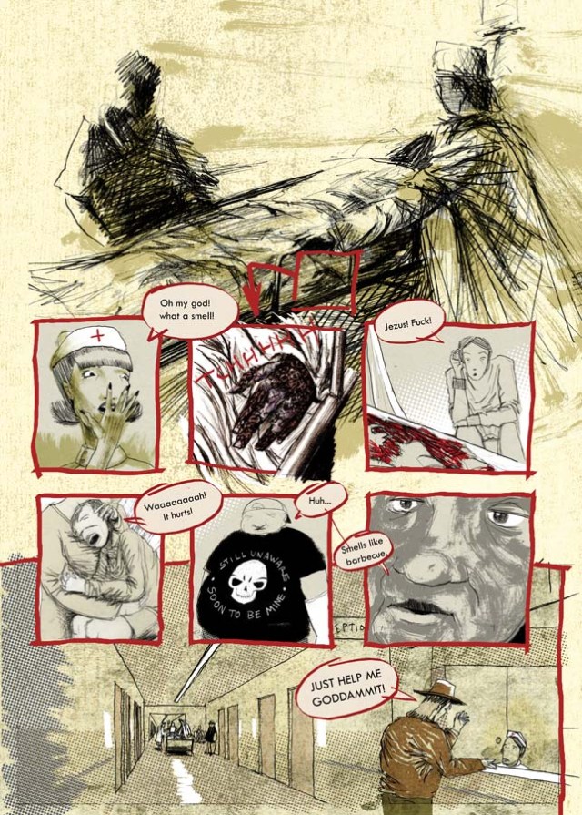 In the advent of this story finding it’s way to a publisher rAccou and me would want to rewrite and redraw a lot of pages before it sees print. rAccou doesn’t have the time tough to do this, unless we’re sure that it’s getting published. Understandable if you know that we probabely shouldn’t expect a major income from making comics. But if we don’t rework this material we probably won’t find a publisher. The snake tends to eat it’s own tail.