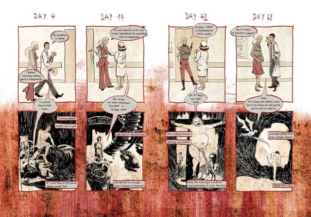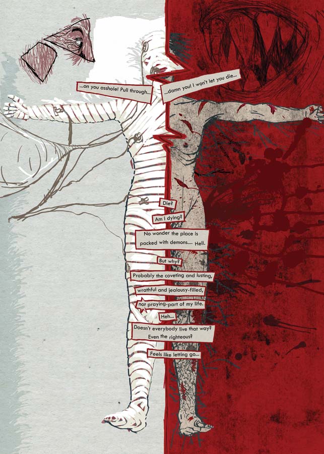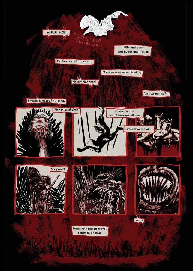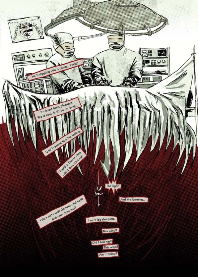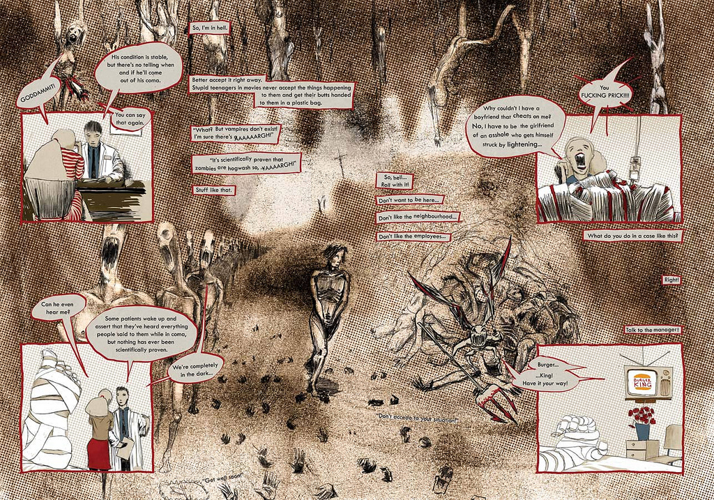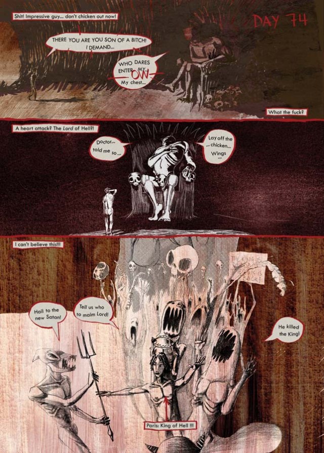 The choice for that specific format wasn’t entirally a coincidental one. First of: we were dealing with a story involving Satan and hell and, be honest, 666 pages would have been a bit too brash. The second reason was that American comics normally consist of 22 pages. If a publisher would show some interest it could be published in 3 neat issues. Ha ha.