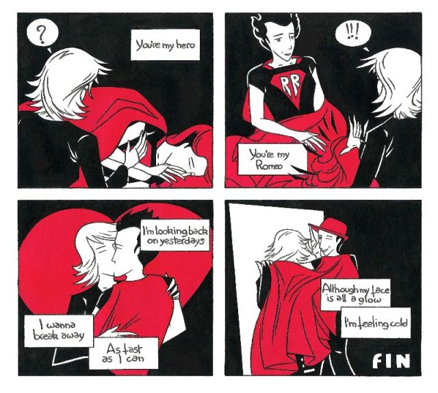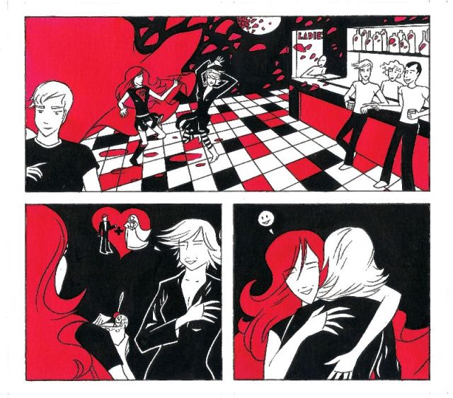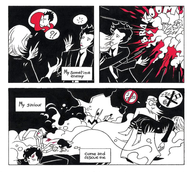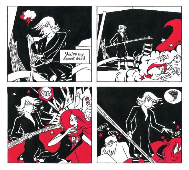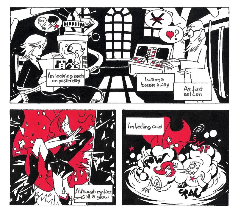Master Lie was in those days playing with the band Ruby Redness. They stood on the verge of releasing their first single, “Sweet Devil”, and the idea hit us to dress that release up as a comic. Master Lie gave us the lyrics and Tim F. Van der Mensbrugghe and me thought up a story around them. I whipped up the script and we asked Vers (Tom Verschueren) to draw it. Vers is a very integer man who doenst want anything to do with commercial things but he still agreed to take on the comic.