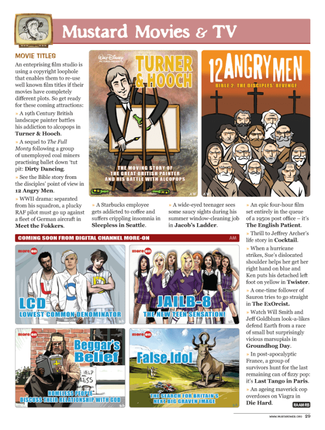 Er zijn deze week geen strips uitgekomen die er bovenuit springen naar mijn bescheiden mening. Daarom richt ik mijn liefdespijlen op Mustard Magazine. In dit Britse, satirische magazine staan amper strips, maar dat geeft niet. Dit zijn tijden van graag zien en verbroedering en bovendien is het een ongemeen grappige publicatie, dus…