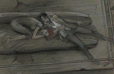 Nog even het beste argument voor deze analyse: de meest beklijvende scène in het boek is die waarin Roem en Julia verliefd worden op elkaar en mekander het hof maken: vier uitmuntend getekende, sfeervolle pagina’s, maar wel zonder tekst…