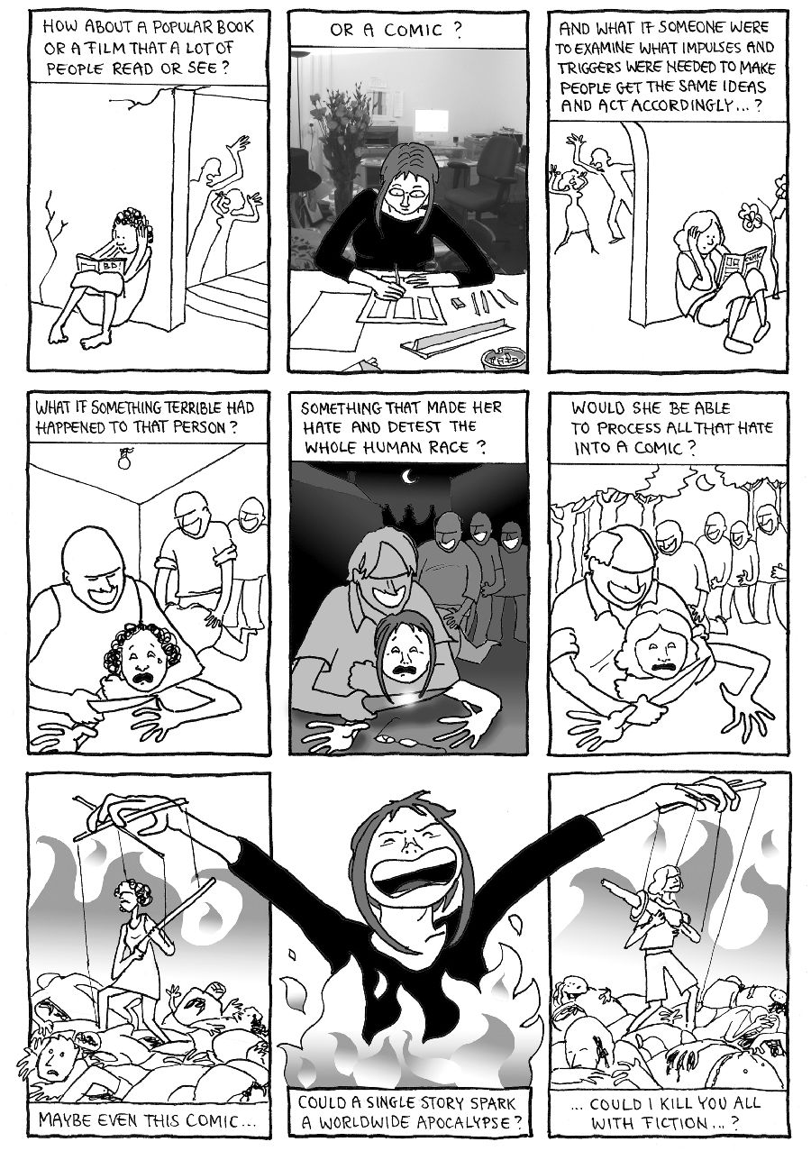 In 2008 the Brittisch theatre group Foolish People came to The Netherlands to play the piece “Terra: Extremitas”. The goal of the project was to reach out to other media so they invited comic makers to contribute comics to the project. The theme of the project was the influence of fiction on reality and, more specific, fictional characters coming to life to meet their makers.