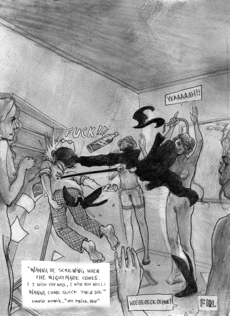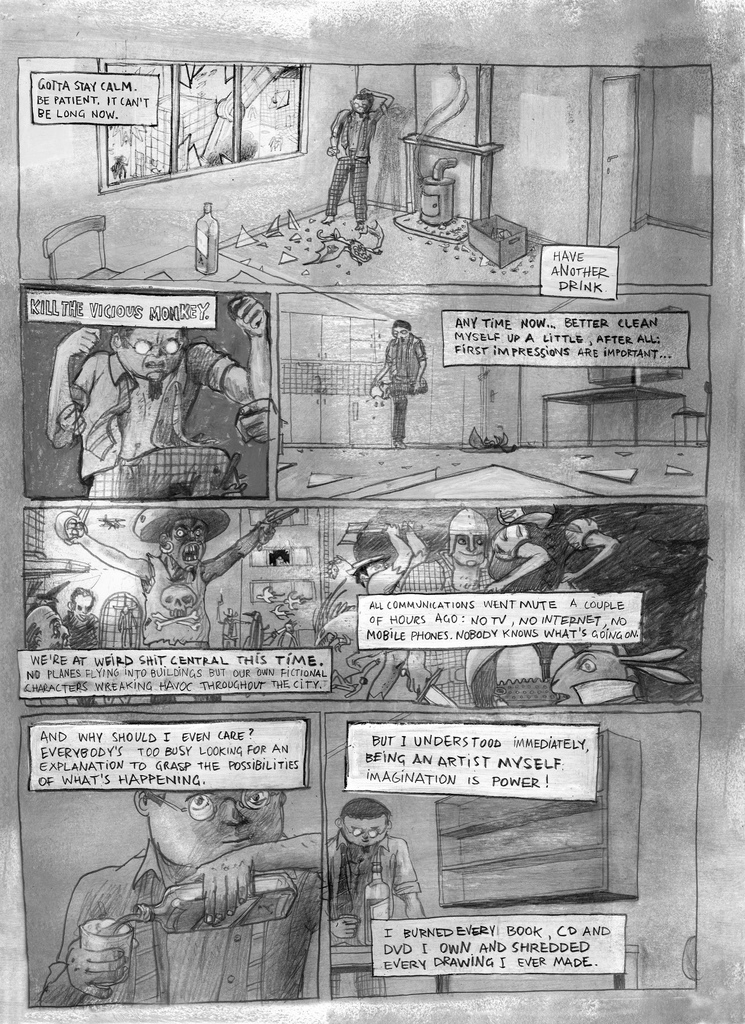 In 2008 the Brittisch theatre group Foolish People came to The Netherlands to play the piece “Terra: Extremitas”. The goal of the project was to reach out to other media so they invited comic makers to contribute comics to the project. The theme of the project was the influence of fiction on reality and, more specific, fictional characters coming to life to meet their makers.