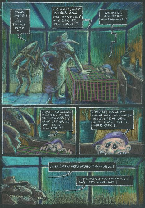 Om dat effect te bekomen hebben ze een slimme truc gebruikt. De karikaturale stijl van Cruyssaert dient om de “echte” wereld weer te geven en de iets meer dromerige stijl van Brutin dient voor de scènes in het onderbewustzijn van de commissaris.
