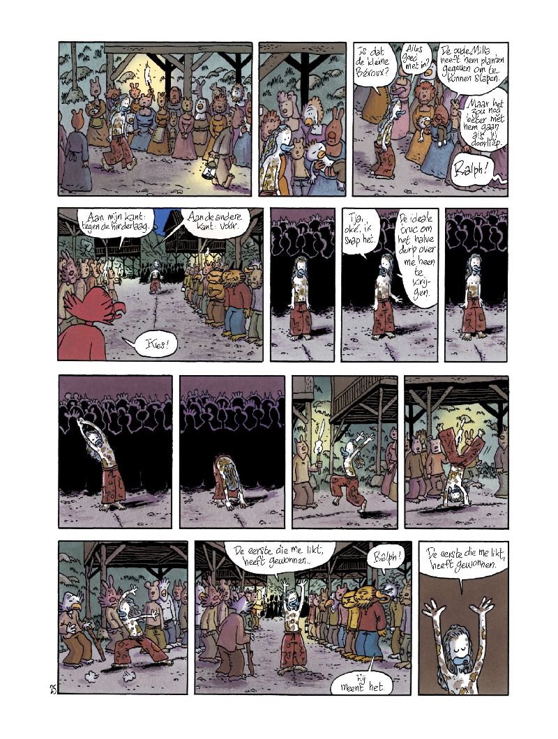 Wat deze strip echter onderscheidt van “Donjon” is dat er meer emotie inzit. Daarmee wil ik niet gezegd hebben dat “Donjon” een soort emotioneel Antarctisch ijsveld is maar dat de aanwezige emoties niet echt heel diep worden uitgespit.