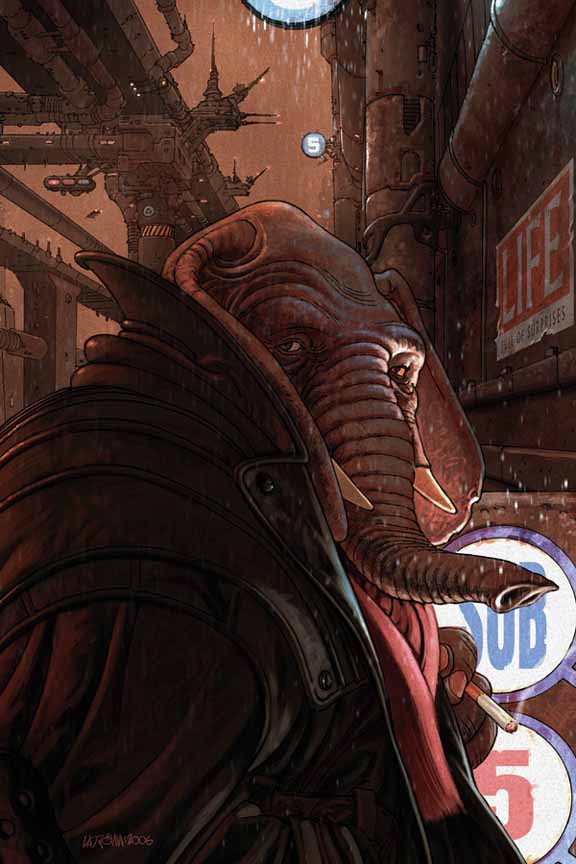Zeldzamer zijn de strips waarin antropomorfe personages een wereld delen met “normale mensen”, hoewel dat meestal wel tot interessante toestanden leidt. “Elephantmen” is zo’n strip en het feit dat de comic zich in de toekomst afspeelt maakt de zaken er nog boeiender op.
