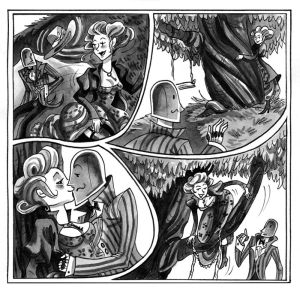 Met die plaatjes zit het trouwens wel snor. In een simpele, cartoonesque stijl worden volupteuze meiden en lekkere mannen afgebeeld. Het feit dat de strip in grijstinten werd gedrukt draagt bij aan de Victoriaanse sfeer en de frivole omkadering rond de prenten maken meer deel uit van het liefdesspel zelve dan dat ze de prentjes netjes verdelen.