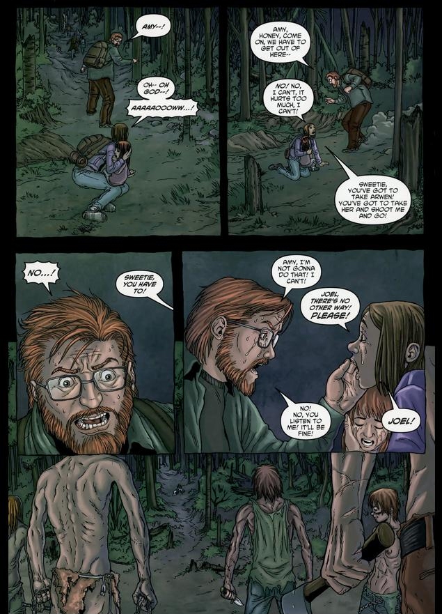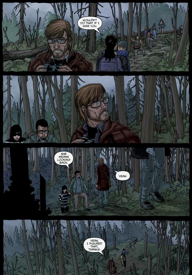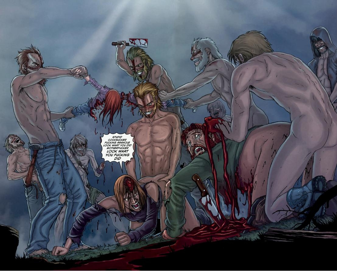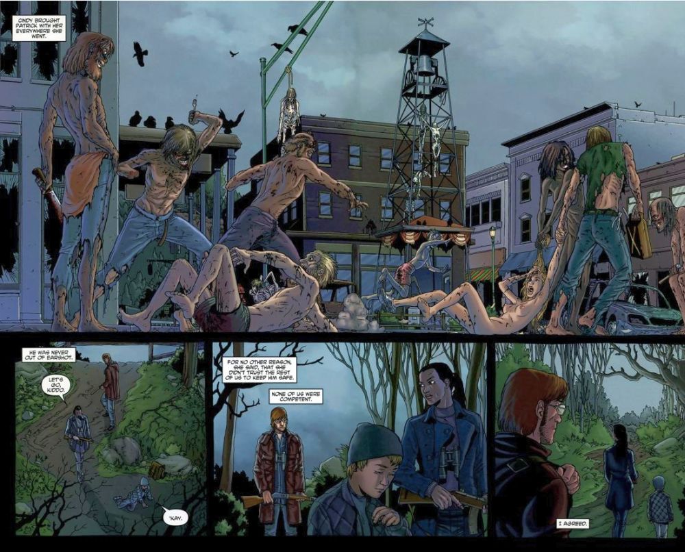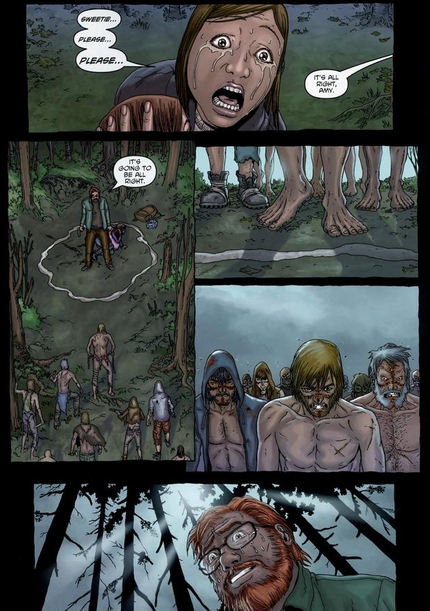 Op een bepaald moment dwingen de gebeurtenissen hem om zijn theorie te testen. Een groep menselijke overlevers, waaronder zijn vrouw en dochtertje (genaamd “Arwen” begot), wordt in een bos ontdekt door de crossed en moet op de vlucht slaan. Wat volgt is één van de pijnlijkste stripmomenten die ik ooit onder ogen gezien heb en in zekere mate zit er een heel klein beetje humor in de tragiek. Ik heb het hier over het aspect van de nerd die ten onder gaat aan zijn nerdiness. Echter nogmaals, u zal er niet om moeten lachen. En doet u dat wel, dan hoop ik dat u snel professionele hulp zoekt…