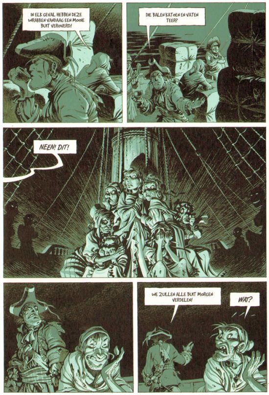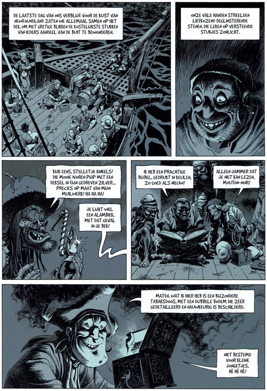 En we mogen in onze handjes wrijven dat Reb’s deze taak op zich heeft genomen. Initieel dacht ik: “Pfff, weer een piratenstrip”, maar deze is toch anders dan de rest. Naar alle waarschijnlijkheid heeft het originele boek daar veel mee te maken maar aan de teksten in dit boek hangt wat meer vlees dan in de doorsnee strip.