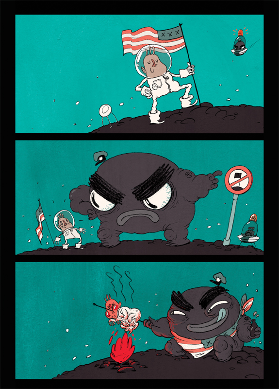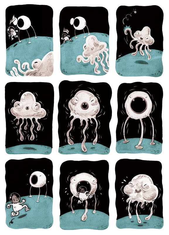 Charlotte Dumortier studeerde dit jaar af aan Sint-Lukas Brussel. Als masterproef maakte ze zeven boekjes met korte gags over een eenzame ruimtevaarder die ze Murphy doopte. Johan Stuyck, die lesgeeft op Sint-Lukas, vond die boekjes zo goed dat hij haar voorstelde om ze uit te geven bij Oogachtend. Maar wat vinden wij daarvan?Wel, eerst en vooral is dit een boek voor mensen die graag kijken. Normale gagstrips hebben een vrij strikte structuur: een zelfde aantal prentjes, steeds dezelfde lay-out of opbouw, … De strips van Dumortier dienden als masterproef en daarvoor worden de studenten aangespoord om al hun kunsten te etaleren. Een gevolg daarvan is dat Dumortier loos gaat met lay-out, ritme, inkleuring en dergelijke meer. Gevolg daarvan is dat geen enkele gag of pagina dezelfde is.