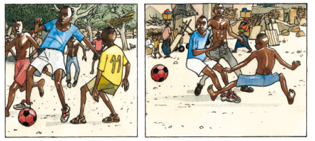 Het maatschappijkritische zit, zoals u al raden kan, vooral in het verhaal van de jonge voetballer. Zonder je iets door het strot te willen rammen schetst Baru de uitzichtloosheid van een bestaan in wat voor ons slechts een vakantiebestemming is, maar voor vele andere mensen een brute realiteit: Afrika.