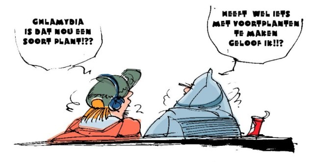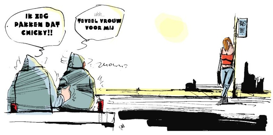 Veelal hebben we te maken met een simpele dialoog; hangjongeren zijn nu eenmaal niet zo actief. Die dialogen zijn gelukkig meestal absurd en/of nihilistisch genoeg om aan het lachen te brengen. Niet elke cartoon zorgt echter voor een lachsalvo. Sommige zijn eerder een soort van tranche de vie die in plaats van een schaterlach een lachje van herkenning op het gezicht tovert. Welke man is bijvoorbeeld nog nooit op masturberen betrapt. (Ik niet, hout vasthouden.)De tekeningen zijn een krasserig geheel van met de computer bewerkte beelden. Het belangrijkste gegeven aan een cartoon is dat je meteen ziet wat er in de tekening gebeurt en dat zou in dit boekje af en toe een mankement kunnen zijn moest de humor niet zo tekstgericht zijn. De cartoons werden oorspronkelijk in kleur uitgevoerd maar werden, de crisis loert even het hoekje om, in zwart wit afgedrukt. Dat verduidelijkt de zaak natuurlijk niet.