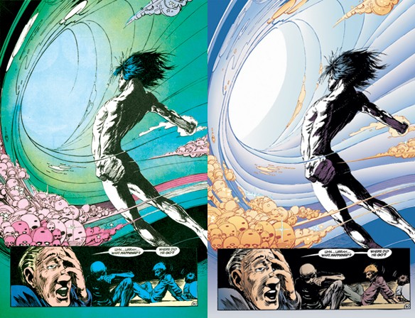 Voor deze edities werden de eerste achttien afleveringen van “The Sandman” opnieuw ingekleurd. Dat is een zegen want, eerlijk gezegd, was de originele inkleuring, naar vandaags technologische maatstaven, redelijk scabreus. (Zie de prent hieronder voor een vergelijking)