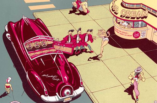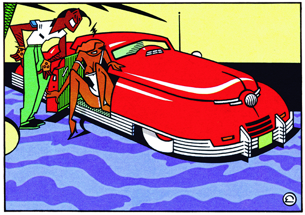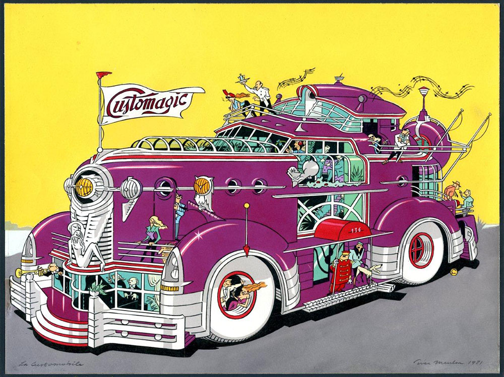 We zouden dus kunnen stellen dat het werk belangrijker (of bekender) is dan de auteur. “Automotiv” gaat weldegelijk dieper in op de auteur achter het werk maar toch is het in de eerste plaats een kijkboek, een koffietafelboek zelfs, en meestal is zo’n uitgave eerder iets voor het gespecialiseerde publiek. “Automotiv” scheert echter hoge toppen, ook onder mensen die normaal gezien niet echt zo heel erg veel interesse hebben voor de grafische kunsten of, godbetert, strips en aanverwanten. Het succes van dit boek blijkt genoeg uit andere dan deze recensie. Sommigen daarvan zelfs gepubliceerd in bladen die anders weinig of nooit strips of prentenboeken (en dat is niet denigrerend bedoeld maar ik vind het woord “Kunstboeken” zo hoogdravend) bespreken. Daarom streef ik in deze tekst niet meteen naar een zoveelste recensie, eerder naar een antwoord op de vraag “Waarom?” Waarom spreekt Ever Meulen zoveel mensen aan? En dan nog met een boek vol nostalgische teksten en tekeningen over auto’s.