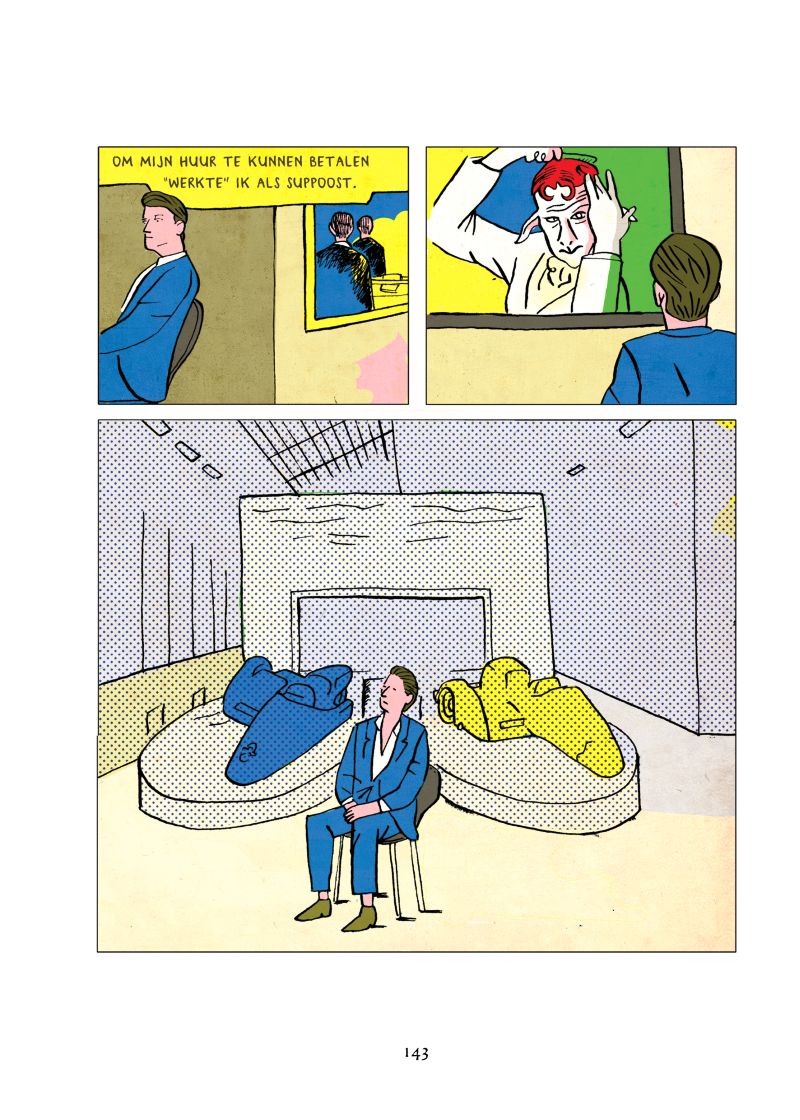 De tekeningen zijn niet echt voor de hand liggend. Hoewel de lijnvoering van van Raffe quasi conservatief strak is, voor sommigen onder u waarschijnlijk te strak en tegen het houterige aan, overspoelt hij zijn pagina’s met vormexperimenten aangaande kleur en lay-out. De simpelheid waarmee zijn personages op papier worden gezet gecombineerd met het absurdisme doet af en toe aan Kamagurka denken. De experimenten met zeefdruk aan Olivier Schrauwen.