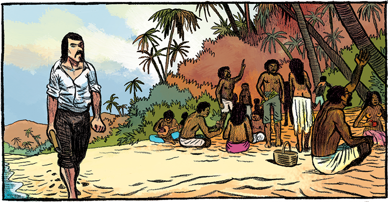 De locatie waar het verhaal zich afspeelt vraagt daar ook naar: het grootste deel van het boek situeert zich af op de Marquesaseilanden, die deel uitmaken van Frans-Polynesië. Subtropische, groene jungles doorspekt met de kleurenpracht van weldadige fauna en flora en af en toe het bruin van mooi welvende, naakte eilandbewoonsters. Opmerkelijk is dat de tekeningen er zeer organisch uitzien maar blijkbaar toch ingekleurd zijn door een derde auteur: Marie Galopin. (Valt het u ook op dat het merendeel van de inkleurders eigenlijk inkleursters zijn? Is inkleuren niet macho genoeg misschien? Of is dat gewoon het gevolg van uitgevers en tekenaars die lang geleden dat, in hun ogen, inferieure taakje eens door de secretaresse liet proberen?)