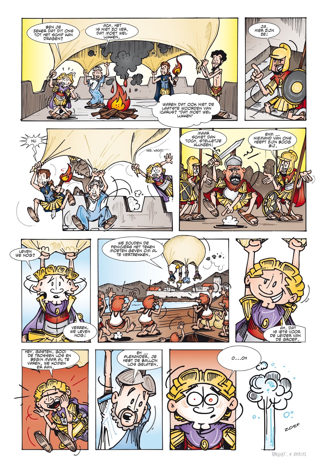 En Bart Proost, de tekenaar van dit verhaal, blijkt inderdaad een hoog geborene. De Alex de Grote gags waarvan hij eerder al een album uitgaf werden voorgepubliceerd in diverse magazines: Strips2Go!, Strike, P@per, en dan vergeet ik er waarschijnlijk nog wat. En nu betrekt hij scenarist Barcas in het geheel om een eerste lang verhaal van zijn personage op ons af te vuren.