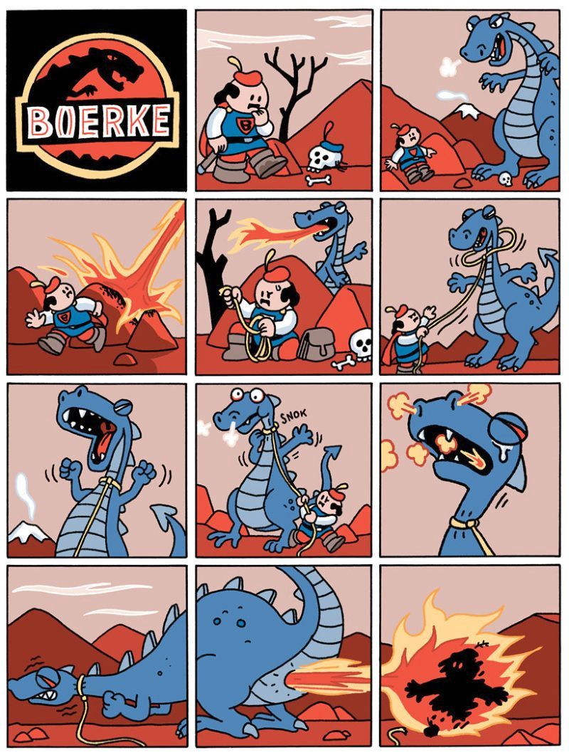 De tekenstijl draagt daar heel veel aan toe. Met dikke, volle lijnen schets De Poortere een bedrieglijk licht aandoende wereld. Boerke is een liefdeskind geboren uit een orgie met David Lynch, Nijntje en alle Monty Pythons samen. Benieuwd wie van die bende het kind heeft moeten dragen.