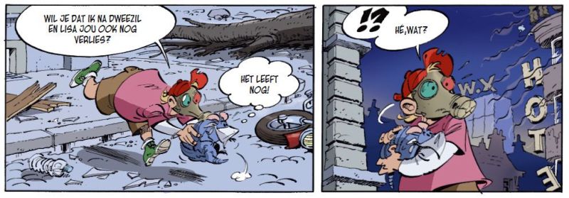 Dat neemt niet weg dat Cambré in dit album begint met een flinke scheut mysterie om de leeshonger wat aan te wakkeren. Brains wordt wakker in een apocalyptisch landschap en betreurt de dood van zijn twee kompanen en nadien volgt het verhaal: een flashback over hoe alles zo gekomen is. Sterke openingsscène. Wat volgt is iets met dodelijke virussen, een stuk van het brein van Einstein, brainwashing, dolgedraaide robots, leeuwentemmers met angststoornissen, de Rode Duivels in kinderversie, internet dat plat valt en voor eens en voor altijd een definitief antwoord op de vraag: “Wat was er eerst, de kip of het ei?” Als u dat allemaal iets te cryptisch aandoet: in de strip zelf worden al die zaken op logische wijze met elkaar in verband gebracht. Hou uw portefeuille du maar in de aanslag.