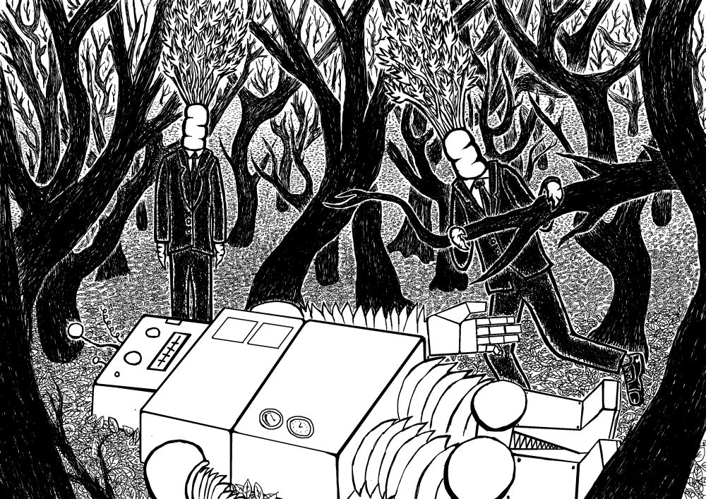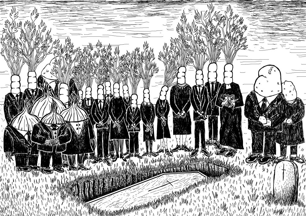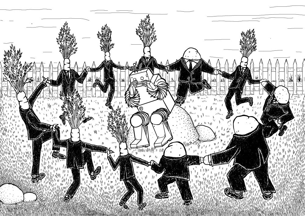 De hoofdrolspelers in deze LSD-trip zijn groenten met een kostuum aan. Een pak, met das en alles. Elke prent beeldt een scène uit die gaat van absurd tot provinciaal, van pervers naar melancholisch en van grappig naar onbegrijpelijk. Darktrousers slaagt er echter in om elke afbeelding onderliggende spanning en emotie mee te geven. Bij mij riepen de prenten beelden op van het Vlaamsche achterland, van suburbia en de beklemmende sfeer die daar soms kan hangen, beelden van gezinnen die niet meer met elkaar praten of erger. Dat ik hierbij aan een Vlaamsch achterland denk bewijst ook de universaliteit van dit boek. Ik vermoed in Darktrousers immers een Nederlander. Misschien zie ik wegens een onherroepelijk beschadigde geest gewoonweg teveel in dit boek. Dat kan ook natuurlijk. Misschien zijn sommige prenten simpelweg een neushoornkever op een driewieler.