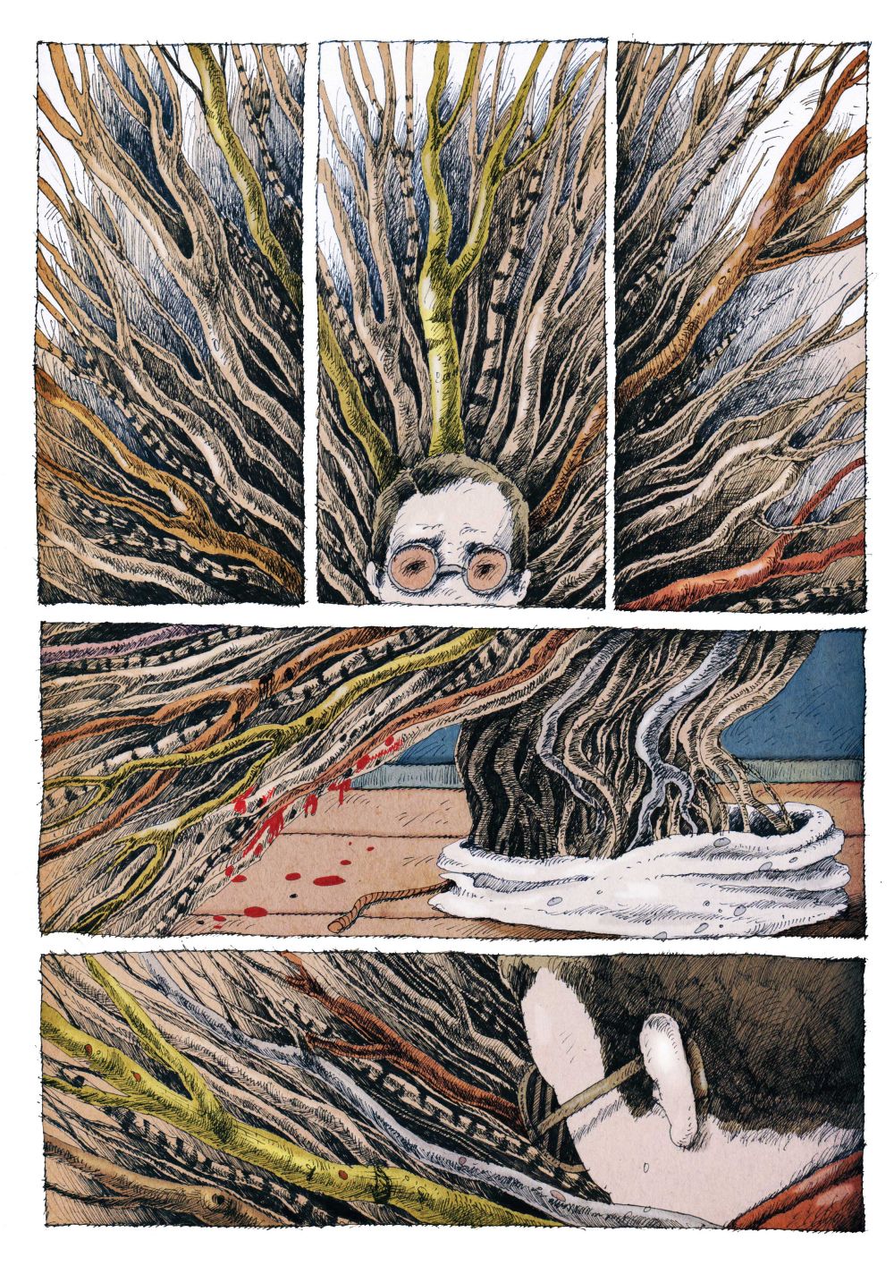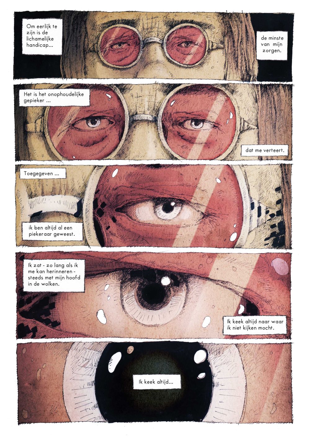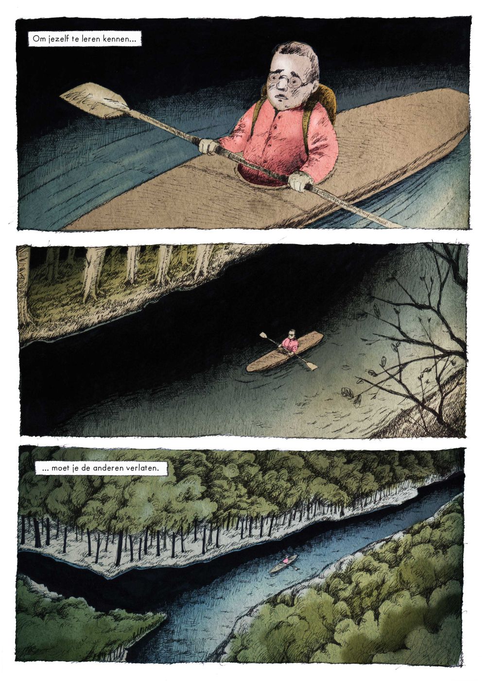 Zijn achtergrond in animatie schemert door in de pagina’s, die soms een beetje weg hebben van storyboards. Het verhaal vloeit van de ene prent naar de andere, wat een zeer aangename en verstilde leeservaring oplevert.