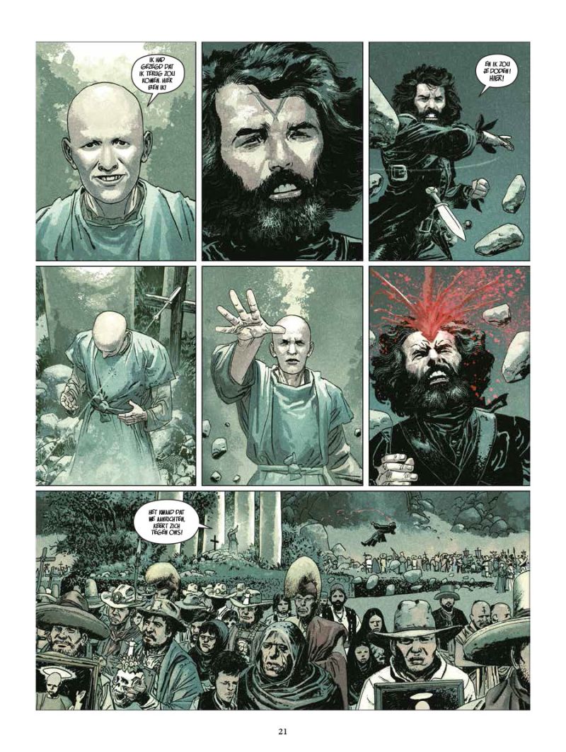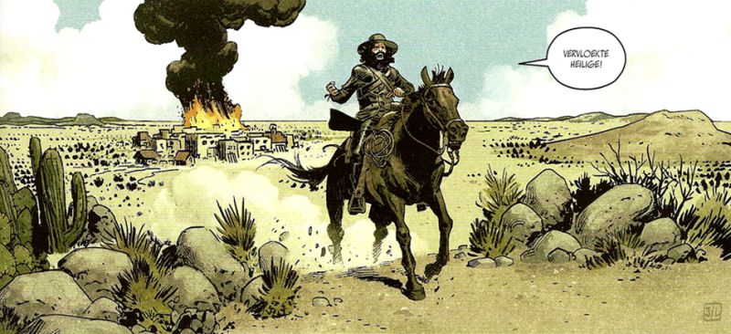 Jodorowsky begint het boek met zichzelf op de borst te kloppen in een kort inleidend stukje waarin hij zichzelf duidt als iemand die buiten de lijntjes kleurt. Omdat de man een resem kwalitatieve dingen gemaakt heeft zien we zijn licht arrogante toontje door de vingers. ‘De Zonen van El Topo’ had eigenlijk een film moeten worden, maar het budget is nooit rond geraakt. Jodorowsky licht toe dat hij het verhaal zo geschreven heeft dat het leest als de film die het had moeten zijn. Door in een rooster te werken met slechts drie banden slaagt hij wonderwel in zijn opzet. Dit boek is in sé een religieuze western en die lay-out zorgt er ook voor dat de weidse taferelen van tekenaar Ladrönn perfect tot hun recht komen.