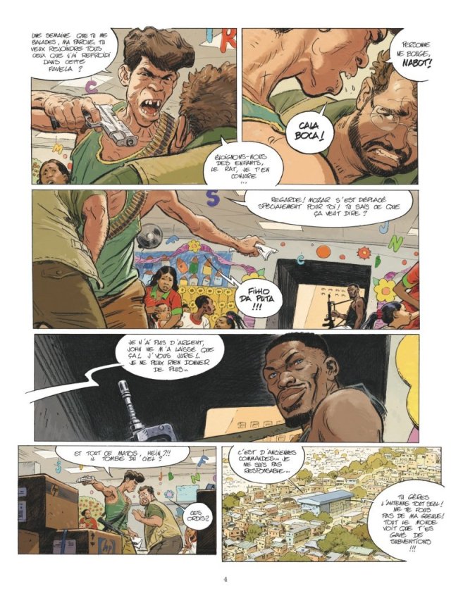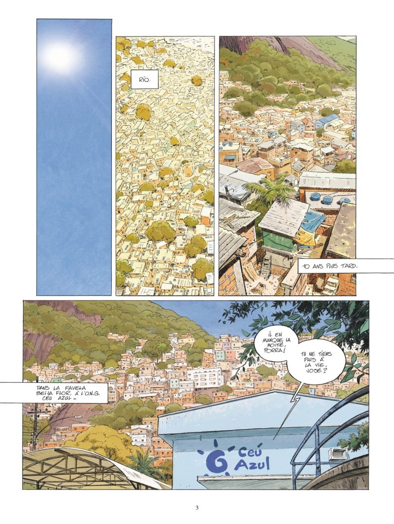 Als een straatbende op het idee komt om Nina te ontvoeren om zo haar adoptievader onder druk te zetten zet Rubeus alles op alles en duikt hij opnieuw de favela’s in om haar te proberen redden. Wat volgt is een verrassend vlot lezende thriller. En dat is geen koud kunstje met zo’n uitgebreide cast: corrupte politieagenten, twee criminele bendes, de familie van Rubeus (van vroeger en van nu), de mensen van de VN, … Deze strip swingt als een tiet en als lezer wordt ja van de eerste tot de laatste pagina in het verhaal meegezogen.